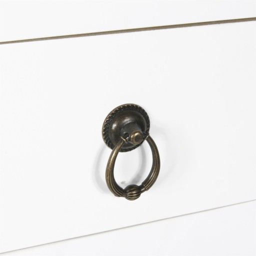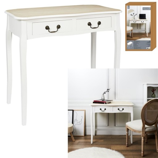 Białe biurko z serii mebli Viktoria dopełni jasne, modne wnętrze i pozwoli na przechowywanie książek i pracę na komputerze w modnym stylu. Ciekawe, nietypowe biurko w białym kolorze wykonane zostało z płyty MDF w kolorze białym, natomiast blat pokryty został wytrzymałą okleiną imitującą bielone drewno. Biurko wyposażone zostało w dwie szuflady z ozdobnymi metalowymi uchwytami. Biurko na wysokich ozdobnych nogach sprawdzi się nie tylko w biurze lub salonie jako kącik home office, ale również w pokoju modnej nastolatki. Biurko wymaga montażu. Wymiary opakowania: 52x24x92cm waga: 15,5 kg
