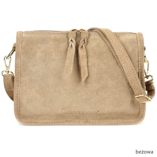 Torebka damska listonoszka znanej i cenionej na rynku europejskim marki BELTIMORE w kolorze BEŻOWYM. Listonoszka wykonana została bardzo starannie z wysokiej jakości włoskiej skóry zamszowej. Torebka ma kształt kuferka i mimo niewielkich rozmiarów jest bardzo pojemna – oprócz telefonu i portfela, zmieści się w niej wiele drobiazgów potrzebnych na co dzień. Mały kalendarz, etui na okulary, czytnik ebooków i słodka przekąska – bez problemu włożysz je do tej torebki! Pasek jest odpinany, więc możesz nosić ją tak, jak lubisz: w ręku, na ramieniu lub jako torebkę cross-body! Oprócz tego regulacja paska umożliwia wygodne dostosowanie jego długości do własnych upodobań. To ponadczasowy model, który z pewnością doda uroku każdej stylizacji – pasuje do sukienki i do jeansów, pięknie podkreśli kobiecy garnitur! Wewnątrz torebki: jedna główna komora oraz mała, zasuwana kieszonka na telefon lub dokumenty. Wnętrze wykończono solidną, śliską podszewką. Z tyłu torebki znajduje się jeszcze jedna poręczna kieszonka zamykana na suwak. Torebka zamykana jest na dwustronny suwak, ozdobiony troczkami z tego samego materiału, z którego wykonano torebkę. Ze względu na sztywne wykończenie szwów, do torebki nie zmieści się zeszyt ani kalendarz formatu A5. Front torebki zdobi delikatne, tłoczone logo producenta. Jest wyjątkowo stylowa i z powodzeniem dopełni każdą stylizację – jej prosty, uniwersalny fason świetnie komponuje się zarówno z casualową, codzienną stylizacją, jak i strojem wieczorowym.