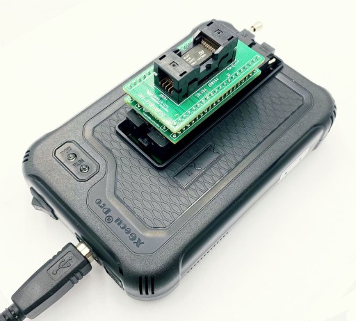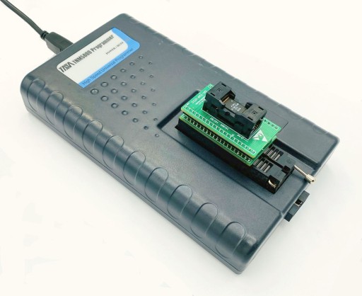 Jednakże ze względu na symetryczne wyprowadzenia obudowy TSOP28 względem DIP28 z powodzeniem można go również stosować do tych programatorów, w których układ wkłada się od przodu podstawki ZIF (XGecu T48 i TL866x, TNM5000 i in) odwracając adapter jak na zdjęciach w galerii poniżej.