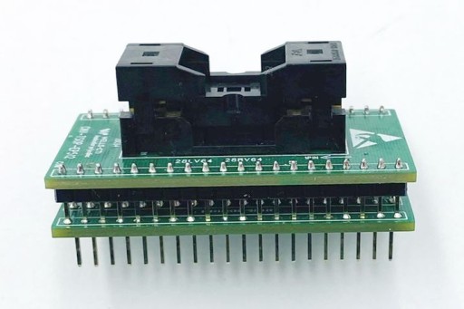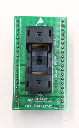 Adapter TSOP28 / VSOP28 (SMD) na DIP28(40) z profesjonalną podstawką typu Open Top ZIF firmy Wells-CTI ( 648-1282211) - adapter dla pamięci EPROM (np. 27BV512), EEPROM (np. 28C64) i Data Flash (np. AT45DB161) w obudowach TSOP28 / VSOP28 (o wymiarach: 11,8x8,1mm z rastrem 0,55mm) pozwalający na programowanie i używanie ich w podstawkach bądź pad'ach DIL40 lub większych programatorów wyposażonych w złącze ZIF ( XGecu, iFix RT809h, TNM 5000, Xeltek Superpro itp) bądź innych urządzeń (np. prototypów, płytek stykowych itp.).