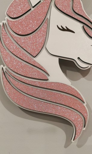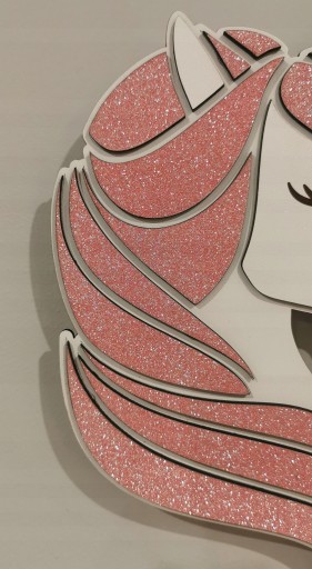 Grzywa konika oraz róg oklejone zostały folią meblową - brokatowy róż oraz brokatowy srebrny. Folia przepięknie, wręcz magicznie się mieni. Efekt jest piorunujący.