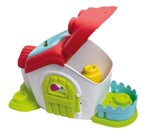 • Część dachu otwiera się, umożliwiając zabawę we wkładanie i wyjmowanie klocków.