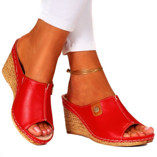 Damskie klapki w kolorze czerwonym na wysokim koturnie z ozdobnym szwem na podbiciu i guziczkiem. Idealnie sprawdzą się jako obuwie codzienne. Z łatwością dopasują się również do eleganckich stylizacji. Profilowana, skórzana wkładka. Szyta podeszwa skutkuje dłuższą wytrzymałością obuwia.