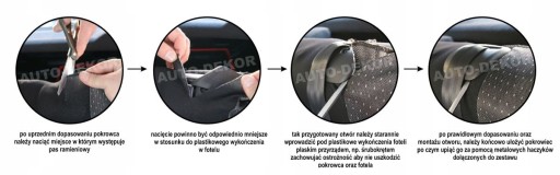 Ze względu na zróżnicowane miejsca występowania otworów na tylne zagłówki, pasy, klamki itp., (co jest uzależnione m.in. od wersji wyposażenia oraz pochodzenia samochodu) otwory należy wykonać samemu, po uprzednim dopasowaniu i montażu pokrowca.