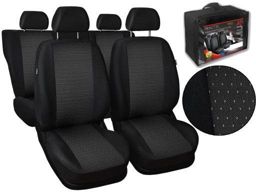 Pokrowce PRACTIC wykonane są z optymalnej jakości materiałów tapicerskich w części bocznej pokrowca w kolorze czarnym, oraz materiału żakardowego w części środkowej, o wzorze podobnym do oryginalnych tapicerek foteli.