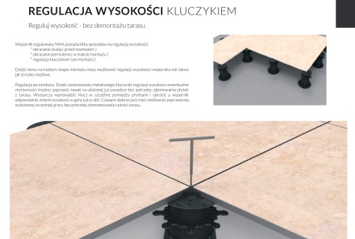 Wsporniki serii MAX mogą być zastosowane jako podparcie wszelkiego rodzaju płyt (np.kamiennych lub rektyfikowanych) z możliwością podparcia punktowego oraz konstrukcji z legarów pod tarasy WPC i drewniane.