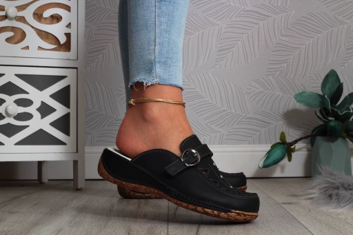 Damskie klapki w kolorze czarnym na niskiej koturnie z ozdobną klamerką. ❤ Wykonane z dobrych jakościowo materiałów. Idealnie sprawdzą się jako obuwie codzienne. Klapki są lekkie i zapewniają wygodę oraz komfort użytkowania. Profilowana, skórzana wkładka z poduszką amortyzującą na pięcie. Podeszwa stabilna, dobrze amortyzuje stopę. Modny, klasyczny fason idealnie dopasuje się do wielu stylizacji! Dobrze prezentuje się na nodze.