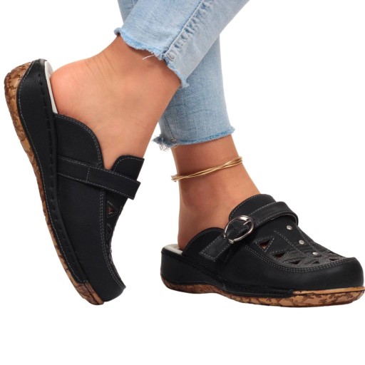 Damskie klapki w kolorze czarnym na niskiej koturnie z ozdobną klamerką. ❤ Wykonane z dobrych jakościowo materiałów. Idealnie sprawdzą się jako obuwie codzienne. Klapki są lekkie i zapewniają wygodę oraz komfort użytkowania. Profilowana, skórzana wkładka z poduszką amortyzującą na pięcie. Podeszwa stabilna, dobrze amortyzuje stopę. Modny, klasyczny fason idealnie dopasuje się do wielu stylizacji! Dobrze prezentuje się na nodze.