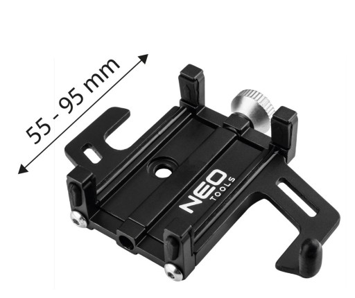 Aluminiowy uchwyt na telefon do roweru 91-000 marki NEO wykonany z lekkiego i trwałego aluminium posiada regulację szerokości za pomocą śruby z pokrętłem. Zakres wynosi od 55 do 95 mm.