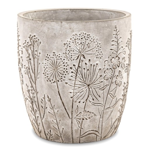 Niespotykana, pięknie zdobiona kwiatami polnymi / dmuchawcami osłonka cementowa w kolorze szarym. Szczególnie pięknie komponuje się z wiosennymi, zielonymi roślinami. Ta niezwykle oryginalna i elegancka donica wprowadzi wiele uroku do każdego wnętrza. Nie posiada otworu do odpływu wody. Idealna dla miłośników niespotykanych dekoracji.