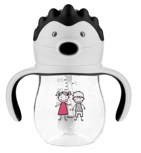 Bidon niekapek z silikonową słomką zakończoną odważnikiem umożliwiającą picie pod każdym kątem nawet przechylając bidon do góry nogami. Szczelne zamknięcie zapobiega wylewaniu się zawartości oraz chroni słomkę przed zabrudzeniem. Transparentność i wyraźna podziałka pozwala na kontrolowanie ilość płynu wypijanego przez dziecko.