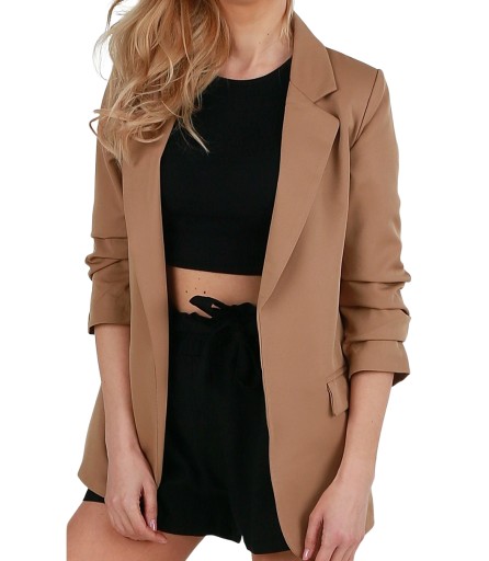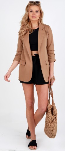 Model dłuższy, smokingowy pasujący do eleganckiego jaki i casualowego stylu. Doskonałe dopełnienie stylizacji do pracy, na uczelnie lub na wieczorne wyjście. Oryginalnego charakteru dodają drapowane rękawy o długości 3/4. Dwie kieszonki po bokach z efektownymi klapami upiększają marynarkę. Fason luźny, z podszewką i miękkimi poduszkami w ramionach.