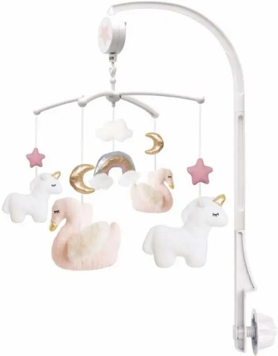 Urocza karuzela, pozytywka nad dziecięce łóżeczko z piękną spokojną melodyjką, która ukoi do snu Twojego malucha. Karuzela w komplecie razem z uchwytem mocującym, zaprojektowana przez szwedzką markę Jabadabado. Śliczne jednorożce, łabędzie i urocza tęcza zaprzyjaźnią się z Twoim maluchem na długo, a znajoma melodia ułatwi zasypianie. Karuzela jest nakręcana, posiada przycisk wyłączania kręcenia się pluszowych zabawek i możliwość samego puszczania melodii.