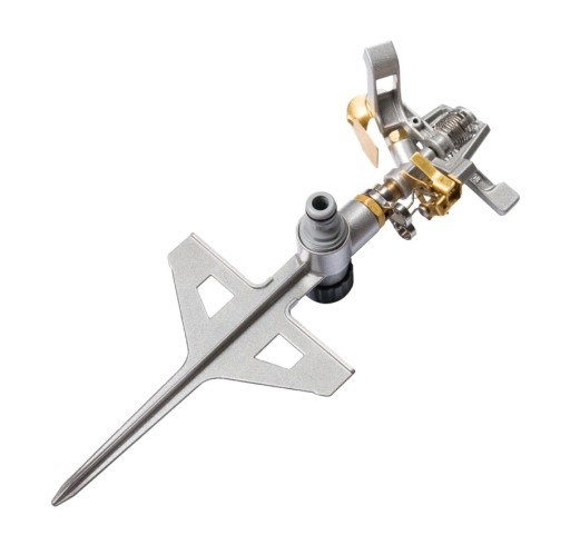 - profesjonalny metalowy zraszacz pulsacyjny na podstawie szpilki z dodatkowymi ramionami, które zapewniają maksymalną stabilność