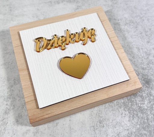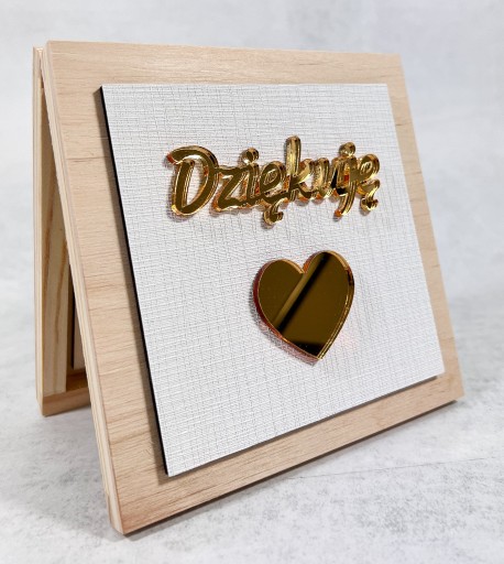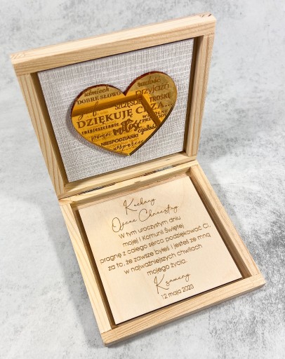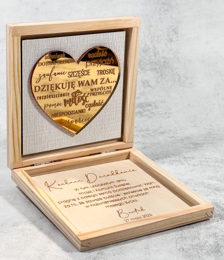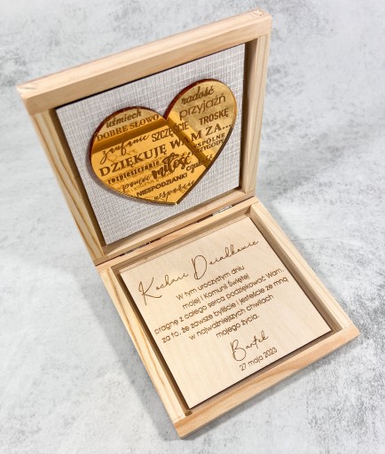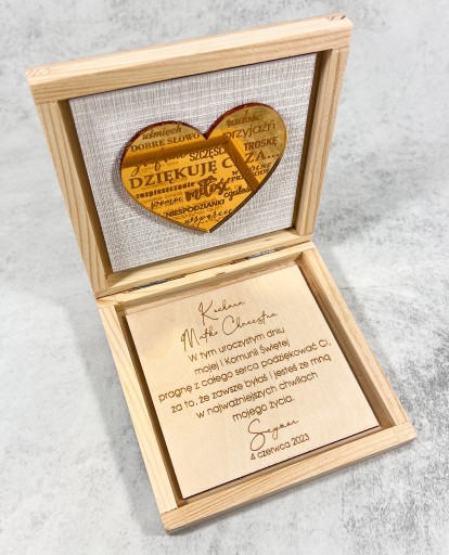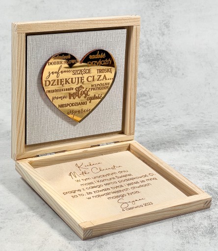 Drewniane pudełko zawiera spersonalizowany tekst oraz złote serce.