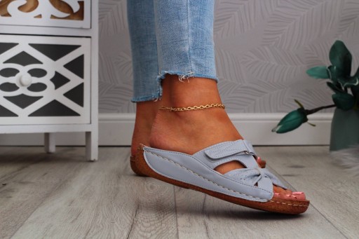 Damskie klapki w kolorze szarym na delikatnym koturnie z zapięciem na rzep. Wkładka profilowana, wykonana ze skóry naturalnej. Szyta podeszwa skutkuje dłuższą wytrzymałością. Prosty fason pasuje do wielu stylizacji.