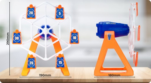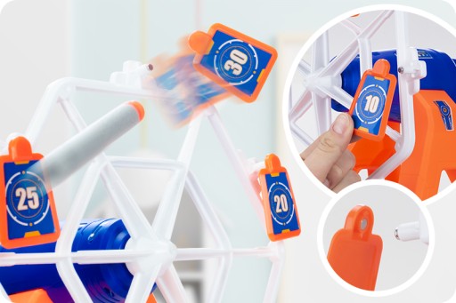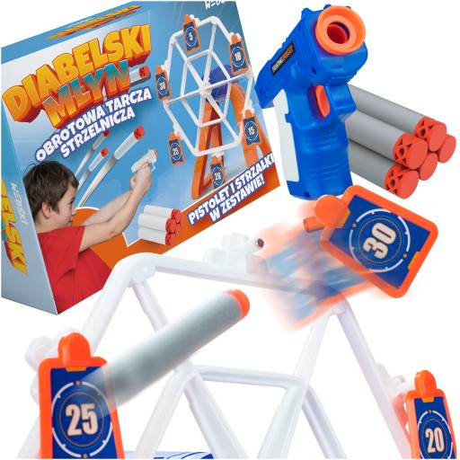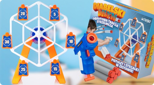 To obrotowa tarcza elektryczna z wiszącymi celami w formie "Diabelskiego młynu". Idealna zabawa dla dzieci i dorosłych w każdym wieku. Weź swój zabawkowy pistolet do ręki i sprawdź się w tej strzeleckiej grze zręcznościowej!