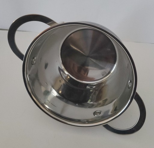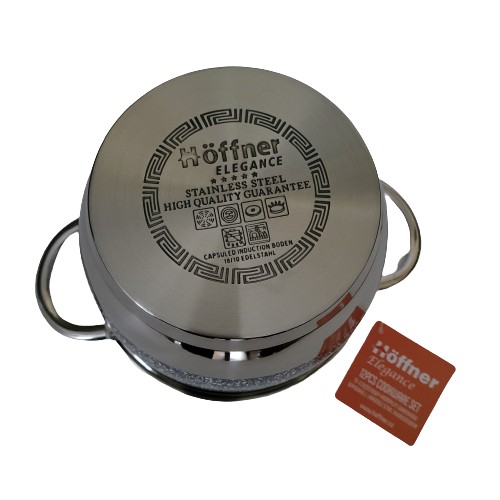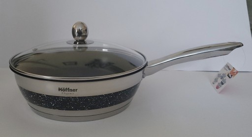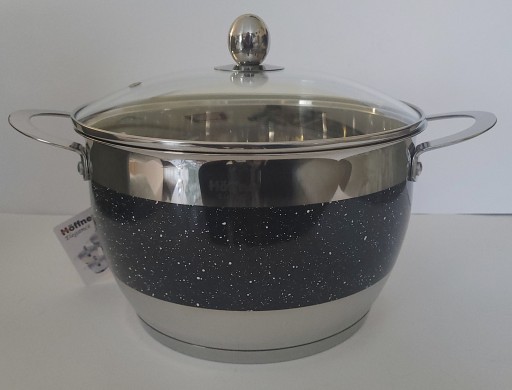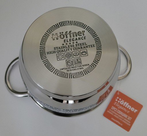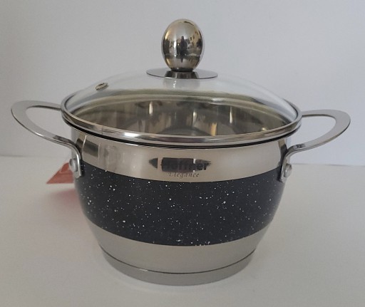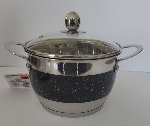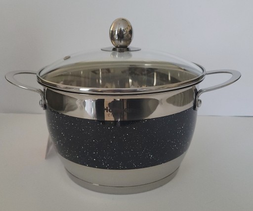 Elegancki zestaw garnków z wysokiej jakości stali nierdzewnej z wielowarstwowym dnem. Każdy z garnków posiada pokrywkę z odpowietrzaczem. Garnki mają wzór czarny granitowy. Wewnątrz garnka jest podziałka. Garnki można myć w zmywarce. Przystosowane są do każdej kuchenki także indukcyjnej. Dno garnków ma aluminiową płytę akumulujące ciepło, gwarantuje to równomierne jego rozprowadzanie, co umożliwia gotowanie z małą ilością wody, pozwalając w ten sposób zachować cenne witaminy w gotowanych potrawach. Wnętrze patelni powleczone jest powłoką dzięki której potrawy nie będą przywierać.