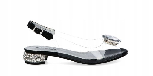 Cholewka składa się z przezroczystego silikonu na przodzie ozdobionej dużym, srebrnym kamieniem. Obuwie posiada profilowaną, miękką, wkładkę. Buty zapinane na sprzączkę. Półokrągły obcas jest cały wysadzany migoczącymi kryształkami. Sandałki mają odsłonięte palce i pięty, dodatkowo od wewnętrznej strony znajdują się dwa małe okrągłe otwory poprawiające cyrkulację powietrza.