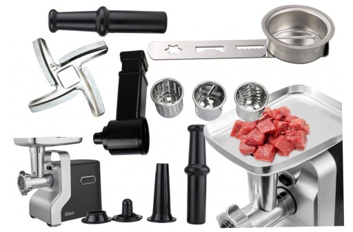 9W1: w zestawie moduł do mielenia mięsa i formowania makaronu, nasadka do kiełbas, nasadka do kebbe oraz ciasteczek, moduł do szatkowania i tarcia.