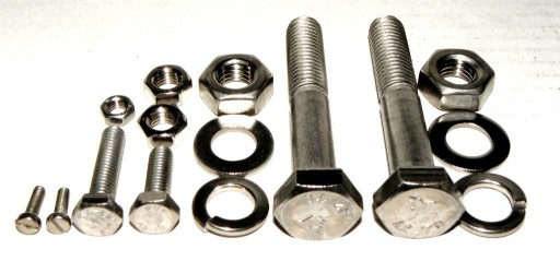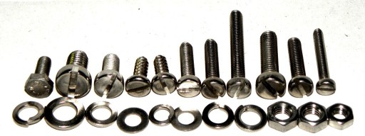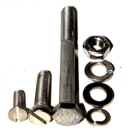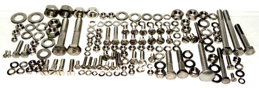 Komplet złożony jest z chromoniklowych elementów nierdzewnych wykonanych w klasie A2 70. W skład kompletu wchodzą śruby, wkręty, nakrętki i podkładki podzielone na 10 osobno spakowanych grup, umożliwiających bezproblemowy montaż poszczególnych elementów motoroweru. Dodatkowo w grupie KIEROWNICA dołożono dwie śruby stalowe drobnozwojne M10 w powłoce ocynku w klasie 10.9 W grupie KOŁA, zestaw zawiera śruby, nakrętki, podkładki do mocowania zębatki koła tylnego. Dołożone śruby stalowe M7 są w powłoce ocynku w klasie 8.8