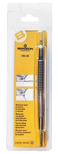 Nowy profesjonalny przyrząd do wymiany bransolet, pasków, teleskopów renomowanej, szwajcarskiej firmy BERGEON. Narzędzie wyposażone jest w dwie końcówki, wybijak oraz widełki pozwalające na demontaż pasków i bransolet.
