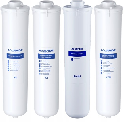- K5 - wkład wykonany z polipropylenu, wykorzystywany jako filtr wstępny do zatrzymania zanieczyszczeń mechanicznych takich jak piasek i rdza. Chroni dalsze etapy filtracji. Usuwa zanieczyszczenia do 5 mikronów (wymiana co ok. 3-4 miesiące - w zależności od jakości wody)