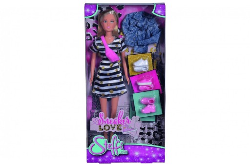 Lalka Steffi w Modnej Miejskiej Stylizacji uwielbia buty i przez cały dzień może przymierzać najbardziej niezwykłe modele sneakersów!