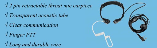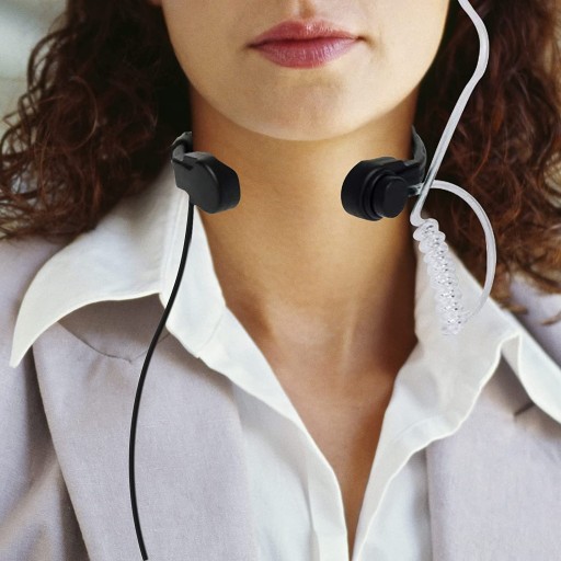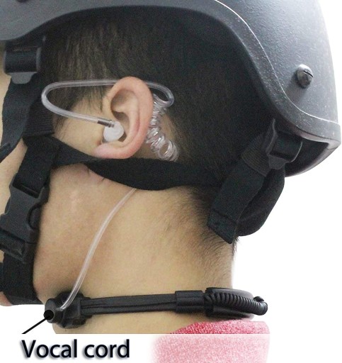Część kontrolna gardła tej słuchawki jest zwijana, dzięki czemu można ją dostosować do rozmiaru szyi, co zapewnia lepszy komfort. Ponieważ mikrofon przesyła bezpośrednio z gardła, nie jest wrażliwy na hałas w tle. Mikrofon do gardła może być łatwo ukryty również pod obrożami. Jest to również idealne do celów nadzoru i bezpieczeństwa na lotniskach, kasynach, kontroli tłumu na konwencjach i koncertach oraz innych środowiskach pracy wymagających dyskretną komunikację.