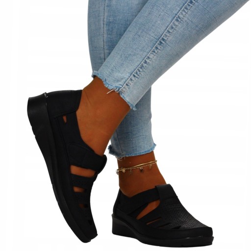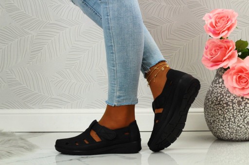 Ażurowe, półbuty damskie z wycięciami w kolorze czarnym na niskim koturnie. Idealne na ciepłe dni. Sprawdzą się jako obuwie codzienne lub do pracy. Zapięcie na rzep ułatwia zakładanie. Wykonane z dobrych jakościowo materiałów. Miękka skórzana wkładka zapewnia komfort użytkowania. Prosty fason łatwo dopasuje się do wielu stylizacji.