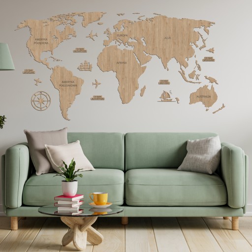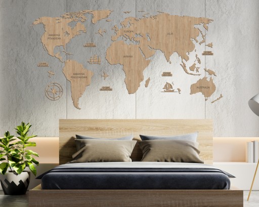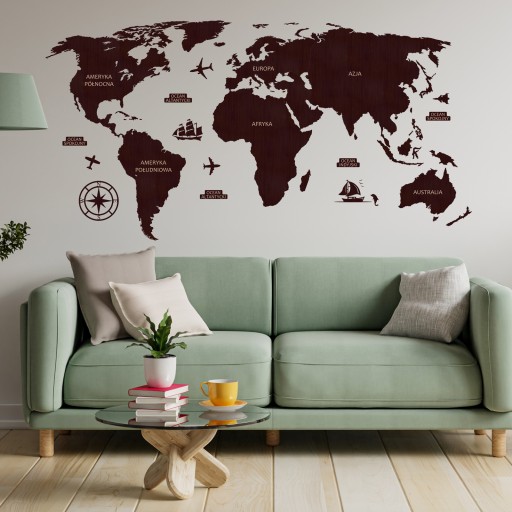 Ponadczasowa elegancka mapa świata precyzyjnie wycięta laserem którą należy przykleić do ściany. Mapa wykonana jest z wysokiej jakości drewnianej płyty HDF o grubości 3 mm ,w różnych kolorach do wyboru, co dodaje jej wspaniałego efektu oraz sprawia, że można ją kolorystycznie dopasować do każdego pomieszczenia.