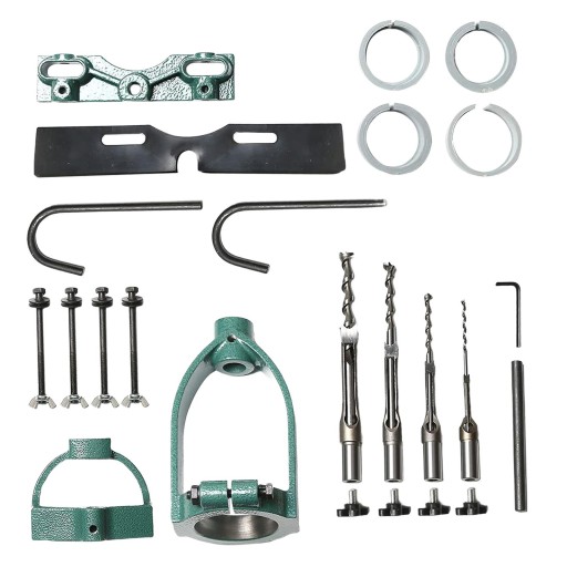 Pakiet zawiera: To mocowanie do dłutowania w komplecie z 4 dłutami wpuszczanymi, 4 dzielonymi tulejami, uchwytem, płotem, walizką do przenoszenia, uchwytem na wędkę, kluczem, zakrzywionym prętem, ramieniem ślizgowym, wiertłem, pokrętłem, śrubą i nakrętką.