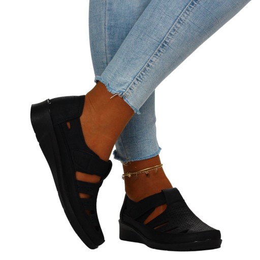 Ażurowe, półbuty damskie z wycięciami w kolorze czarnym na niskim koturnie. Idealne na ciepłe dni. Sprawdzą się jako obuwie codzienne lub do pracy. Zapięcie na rzep ułatwia zakładanie. Wykonane z dobrych jakościowo materiałów. Miękka skórzana wkładka zapewnia komfort użytkowania. Prosty fason łatwo dopasuje się do wielu stylizacji.