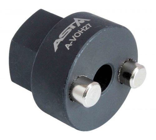 2 zewnętrzne kołki osadzone na nasadce przeznaczone do de/montażu sprężystej podkładki w przednich amortyzatorach.Rozm. klucza: 27 mm.Rozmiar: 24,2 mm x 8,5 mmDł.: 31,5 mm