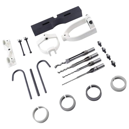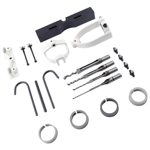 Pakiet zawiera: To mocowanie do dłutowania w komplecie z 4 dłutami wpuszczanymi, 4 dzielonymi tulejami, uchwytem, płotem, walizką do przenoszenia, uchwytem na wędkę, kluczem, zakrzywionym prętem, ramieniem ślizgowym, wiertłem, pokrętłem, śrubą i nakrętką.