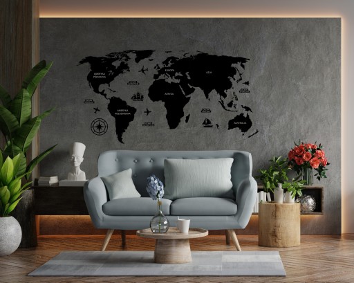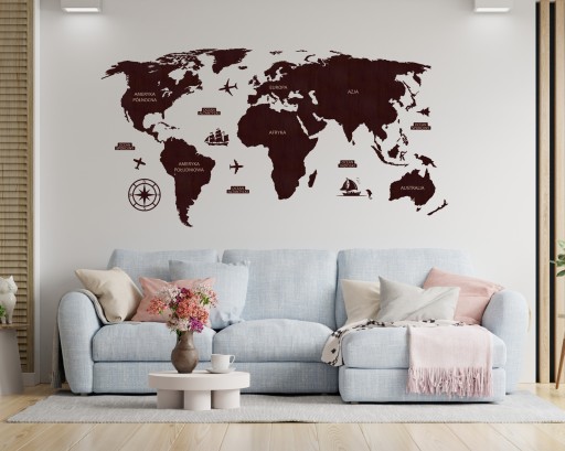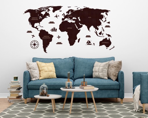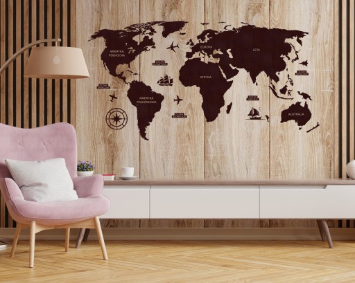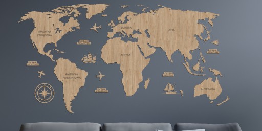 Ponadczasowa elegancka mapa świata precyzyjnie wycięta laserem którą należy przykleić do ściany. Mapa wykonana jest z wysokiej jakości drewnianej płyty HDF o grubości 3 mm ,w różnych kolorach do wyboru, co dodaje jej wspaniałego efektu oraz sprawia, że można ją kolorystycznie dopasować do każdego pomieszczenia.