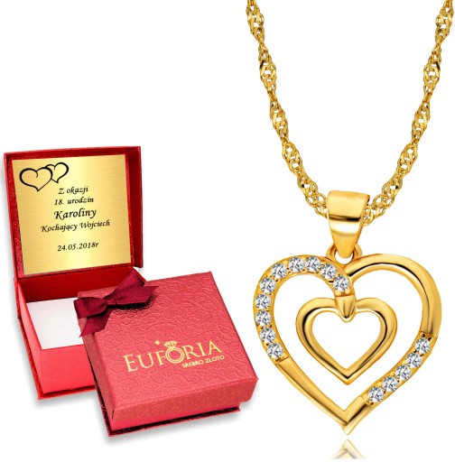 Złocony piękny, modny naszyjnik, łańcuszek wraz z wisiorkiem sercem, sercem wysadzanym diamentowymi cyrkoniami najwyższej klasy.