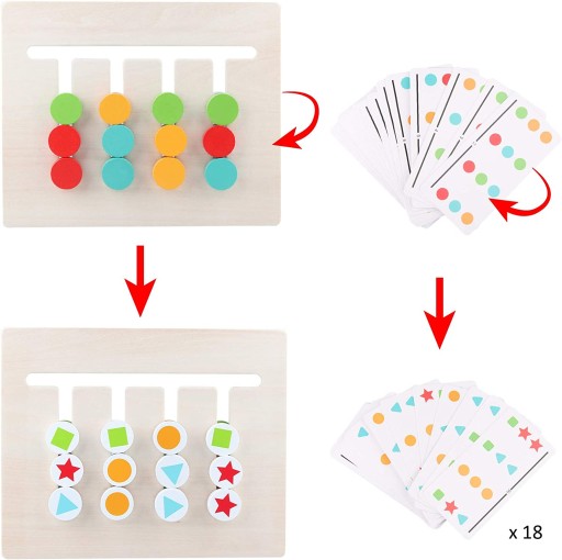 - Pudełko do przechowywania z pokrywką, do której przymocowane są drewniane nóżki. Z jednej strony znajduje się 12 kolorowych kółek (4 kolory), a z drugiej strony widać cztery różne kształty. Wycięcie w skrzynce umożliwia ustawienie pokrywy. Teraz kolory i kształty powinny zostać odbudowane w ciągu jednej minuty zgodnie z zadaniami