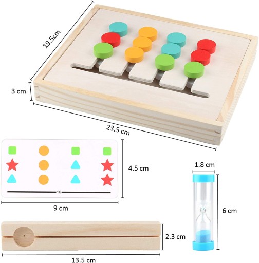 - Zawartość: 1 x drewniana skrzynka, 1 x pokrywka, 1 x klepsydra z plastiku, 18 x kart do zadań (zadrukowane po obu stronach: kolory i kształty) z pasującym drewnianym uchwytem