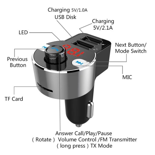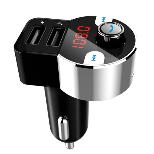 Nowoczesny transmiter Bluetooth FM z funkcją zestawu głośnomówiącego, odtwarzaczem MP3/WMA, możliwością ładowania urządzeń mobilnych po USB i pomiarem napięcia akumulatora.