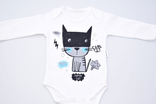 ✅ Białe body z długim rękawem . Na przodzie ozdobna aplikacja – Super Kot.