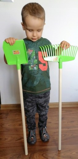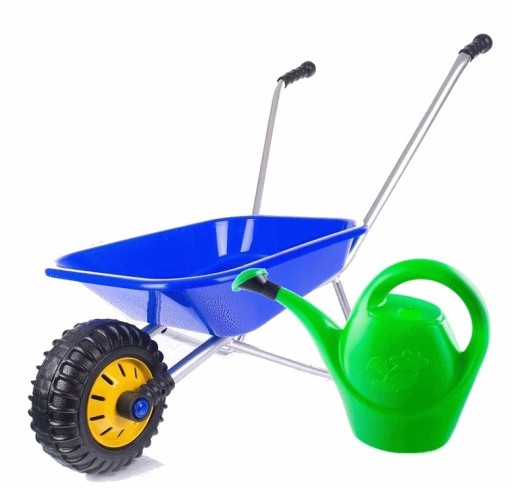SKŁAD ZESTAWU: TACZKI DZIECIĘCE (z elementami metalowymi) + NARZĘDZIA ( grabki do liści oraz łopata)+konewka