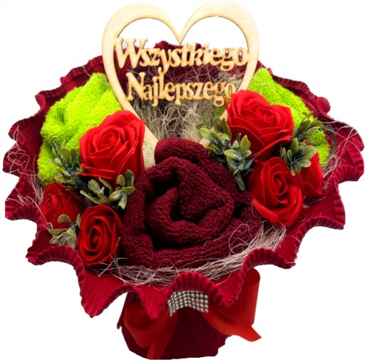Nie szukaj dalej! Nasz bukiet z ręczników oferuje idealne połączenie elegancji i funkcji. Zamiast kwiatów, które zwiędną podaruj bukiet z dwóch wysokiej jakości ręczników, pięknie ozdobiony mydlanymi kwiatami i drewnianym serduszkiem.