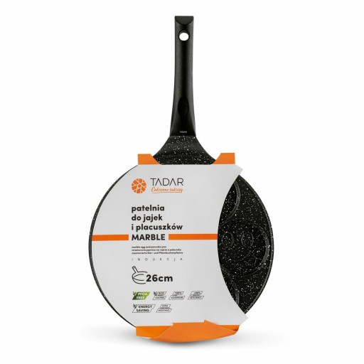 Patelnia marmurowa do pancakes i jajek sadzonych Tadar Marble Buźki 26 cm ma 7 miejsc na naleśniczki lub placki. Poprawisz więc estetykę posiłków w swoim domu. To doskonały pomysł na prezent. Wykonanie z odlewanego aluminium zapewnia jej trwałość. Powłoka non-stick wytrzyma wiele cykli ścierania. Możesz używać na niej mniej tłuszczu. Dania będą smaczniejsze i zdrowsze, a naczynie łatwo się umyje (do mycia ręcznego). Wolniej nagrzewający się uchwyt bakelitowy zapewni bezpieczeństwo użytkownikom patelni marmurowej do jajek sadzonych, pancakes, mini-naleśników i placuszków. Taka rączka dobrze leży w dłoni. Można na niej smażyć, stawiając model na kuchence ceramicznej, elektrycznej, gazowej i płycie indukcyjnej. Bez problemu poradzisz sobie z jej dokładną pielęgnacją i zaschniętymi resztkami ciasta.