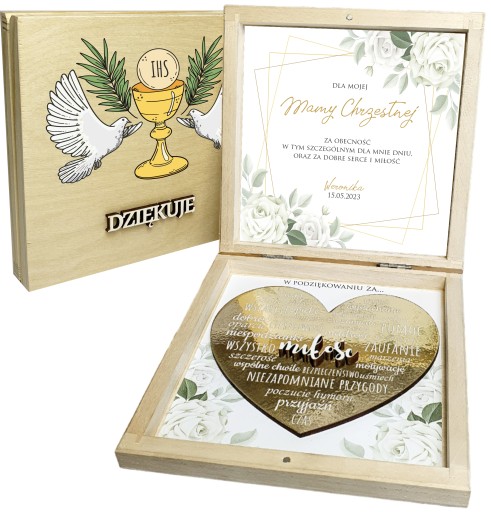 Podziękowanie dla chrzestnych lub dziadków w drewnianym pudełku z okazji I Komunii Świętej