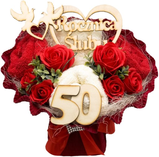 Nie szukaj dalej! Nasz bukiet z ręczników oferuje idealne połączenie elegancji i funkcji. Zamiast kwiatów, które zwiędną podaruj bukiet z dwóch wysokiej jakości ręczników, pięknie ozdobiony mydlanymi kwiatami i drewnianym serduszkiem.