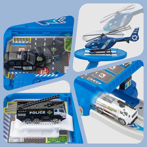Duży parking policyjny z lądowiskiem dla helikopterów, wyposażony w elektryczną windę oraz realistyczne sygnały dźwiękowe i świetlne. Do zestawu dołączono matę o wyglądzie prawdziwego miasta, dwa metalowe wozy policyjne oraz helikopter. Zestaw składa się z 78 elementów.