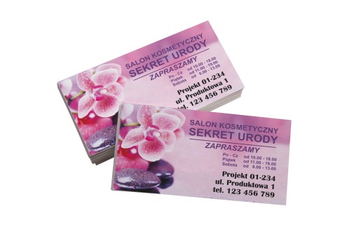Dokonując zakupu na tej aukcji, wydrukujemy dla Ciebie najwyższej jakości 1000szt wizytówek jedno lub dwustronnych na grubym 350g papierze kredowym. Dotniemy je do jednego z najbardziej popularnych wymiarów 90x50mm lub 85x55mm (standard 90x50mm) i wyślemy firmą spedycyjną.