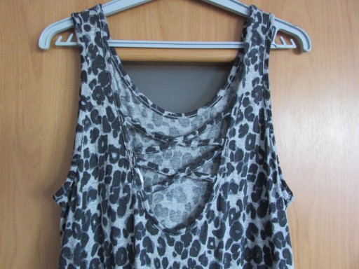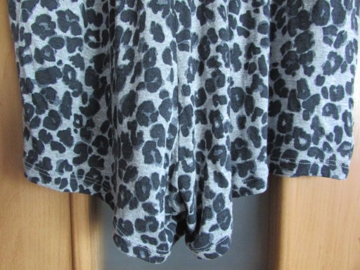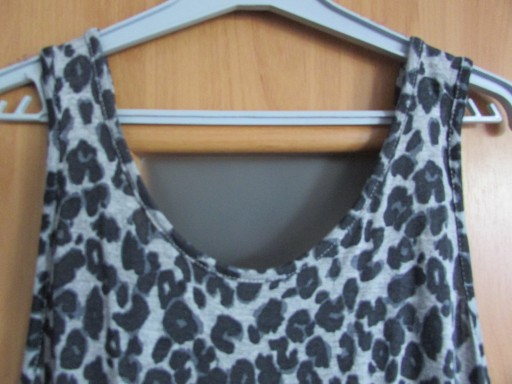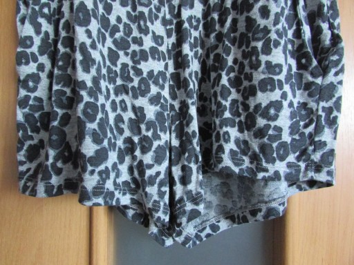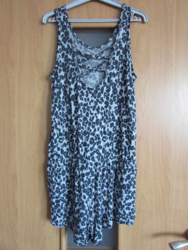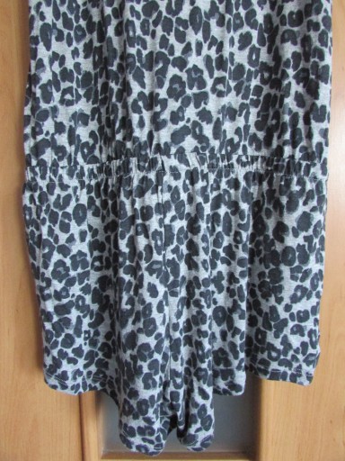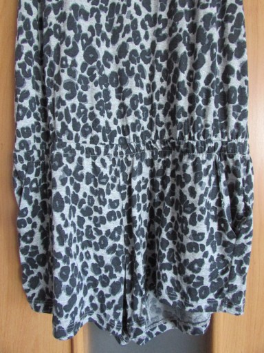 Kombinezon dziecięcy (dla dziewczynki). Kombinezon bez widocznych śladów używania (brak uszkodzeń mechanicznych materiału, materiał czysty, zachowana kolorystyka, bez przebarwień i przetarć, niepostrzępione szycia oraz krawędzie materiału). Kombinezon na na ramiączkach (nieregulowanych) z okrągłym dekoltem. Na wysokości pasa ściągacz. Poniżej pasa po obu stronach kieszenie. Dół kombinezonu nierozpinany. Z tyłu dekolt przepasany paskami. Kolor: szary z cętkami w kolorze czarnym. Kombinezon lekki, przyjemny w noszeniu.
