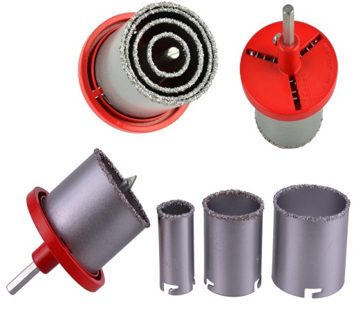 W zestawie: 4 x koronka: 33, 53, 67, 73 mm; adapter mocujący; wiertło prowadzące Krawędź skrawająca pokryta nasypem wolframowym. Zastosowanie: